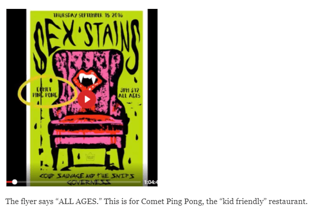 This is from a video from the band called Sex Stains of all things. Looks like a kid video, doesn’t it? With a band named Sex Stains. THAT HAPPENED TO PLAY AT COMET PING PONG, a supposed kid-friendly place that many big wigs frequented.